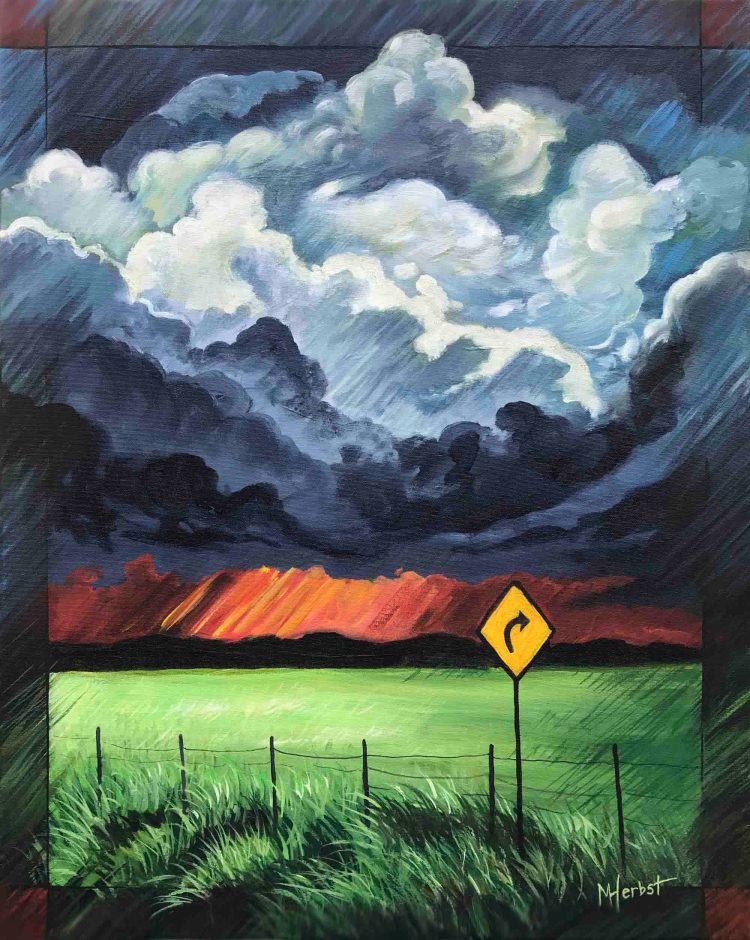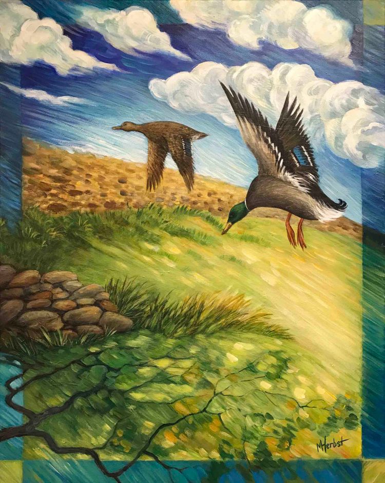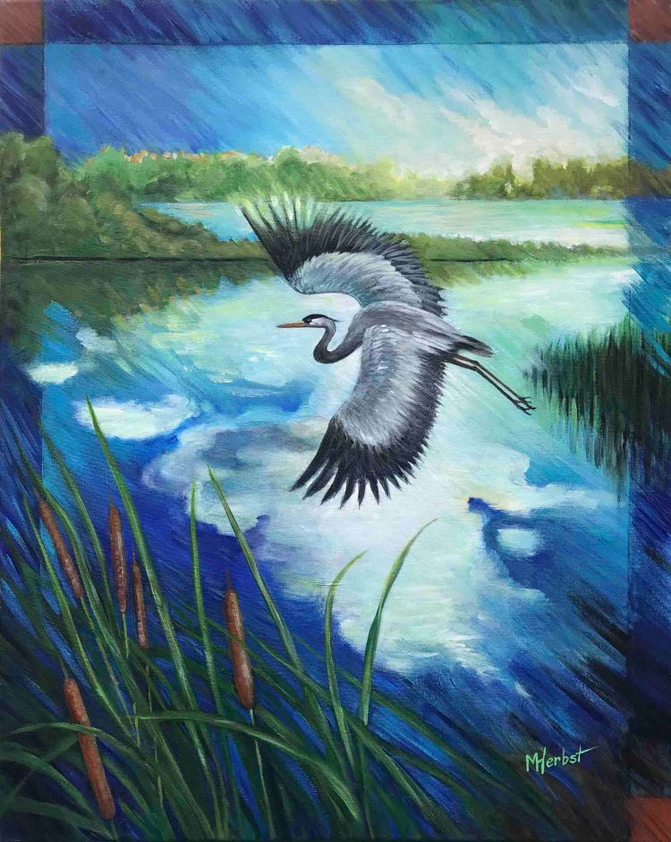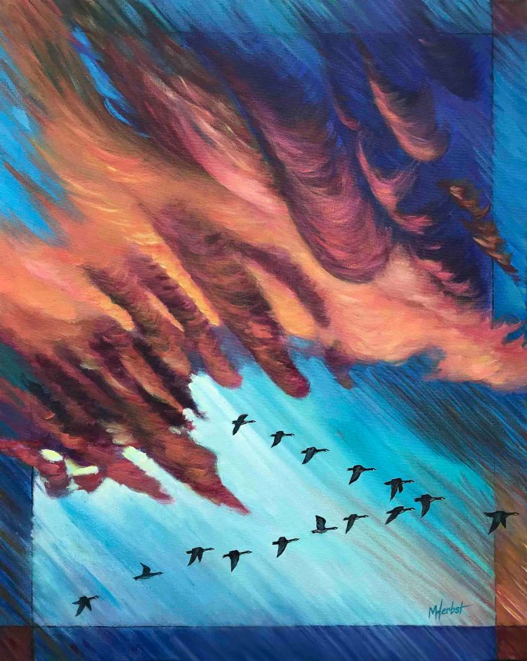 The “Cloud” Paintings were inspired by a series of photographs taken in the Kawartha region. From heavenly “bird-shaped” clouds and the sun rising over an island in Lake Katchewanooka to dark storm clouds on the horizon, their intricate formations fascinate me. A blue heron hunts frogs in the shallow creek that empties into the lake down the road. The still water makes for beautiful cloud reflections. A crow rests on a fencepost, silhouetted against a luminous cloud. The crescent moon over an island is diminished by a huge column of clouds. A pair of mallards fly against the wind, set against billowing clouds, that bring to mind the powerful forces of nature.