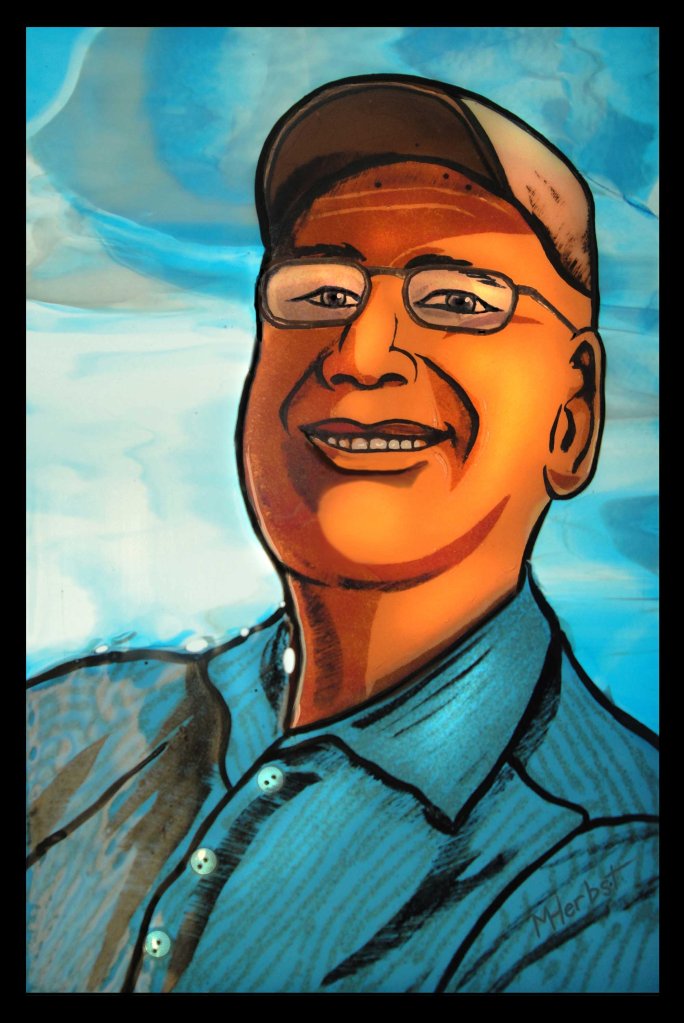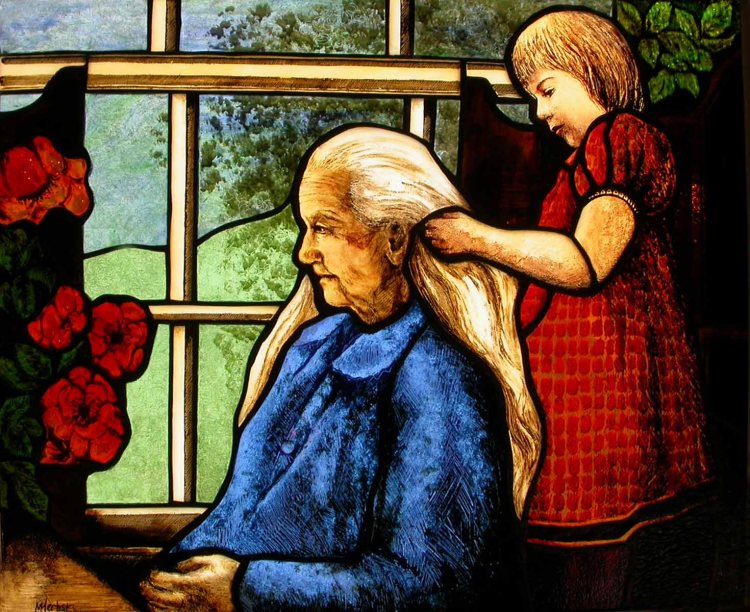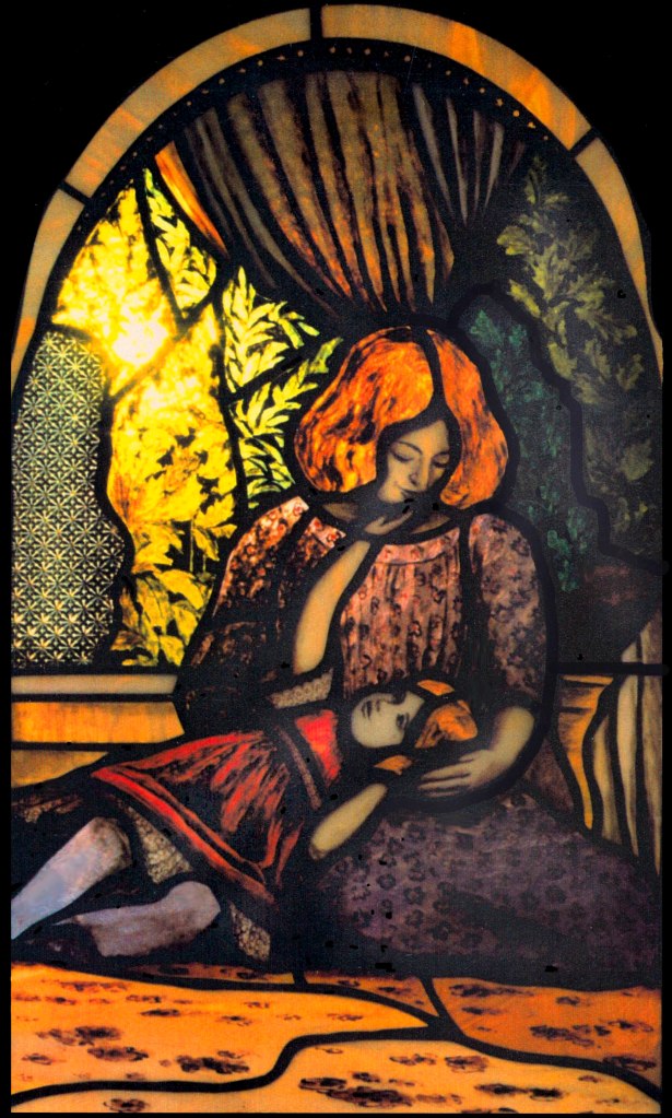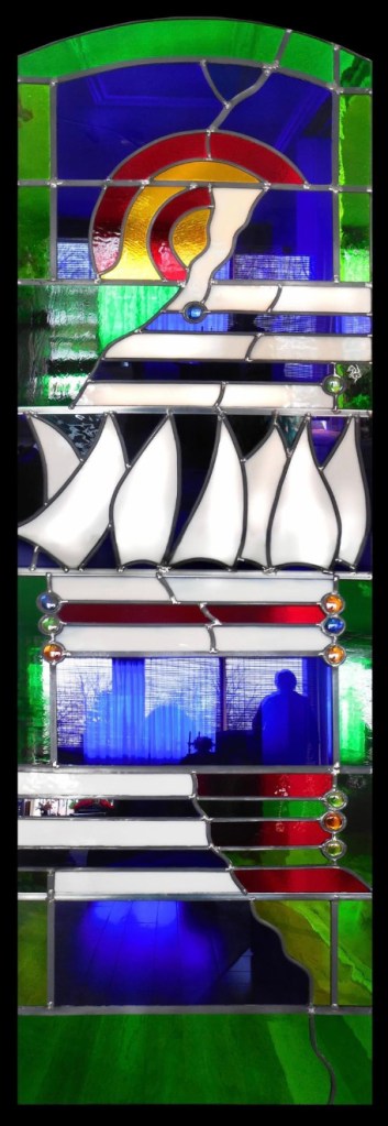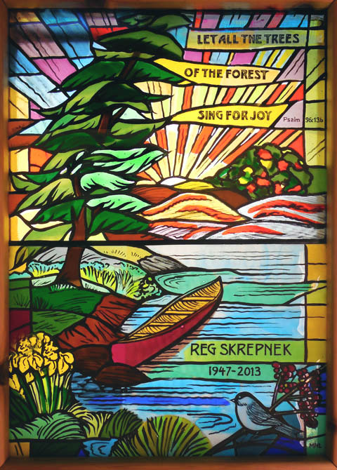 The first four panels were created for International Year of the Child in 1979. They are portraits featuring my young daughter and were included at the “Artists in Stained Glass” show at the Studio Gallery in Oshawa. The next panel is one piece of fused and painted glass (a portrait of my husband, Heinz), included in the “Peterborough In Portrait” show that celebrated 60 years of community living in Peterborough in 2018. The “Fish at the End of the Rainbow” fused, painted and leaded panel features the Lakefield dam, municipal building and clock tower. The abstract nautical window and memorial windows were commissioned by neighbours.