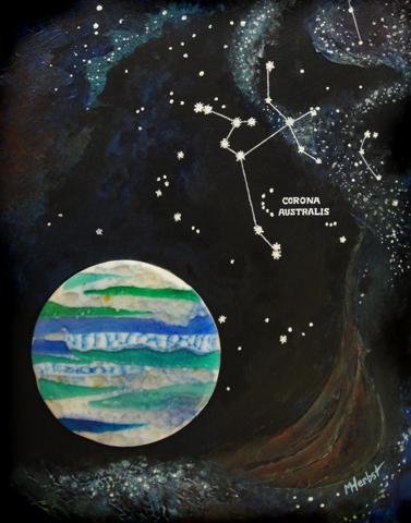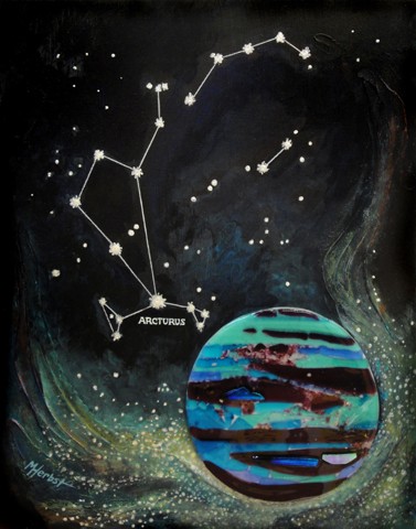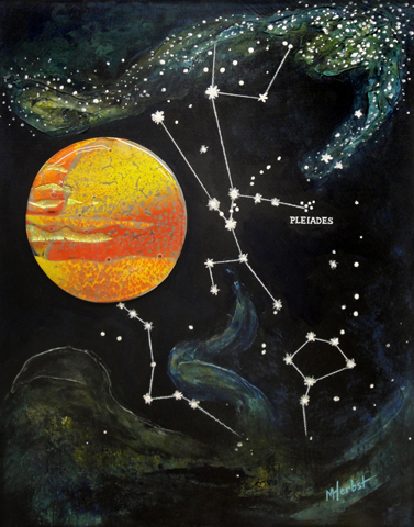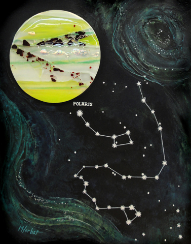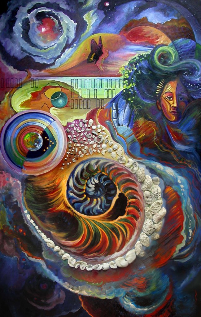 The inspiration for the ‘River of Life’ series came while walking on the beach in Rockport, Texas, on the Gulf of Mexico. The sand was littered with shells, bleached by the sun and weathered by the waves. At night the stars and constellations followed timeless trajectories across the sky. I imagined how many planets must be circling those stars and created fused glass discs to represent them. The River of Life painting includes a “Big Bang” in the top left-hand corner, the “Butterfly effect,” the creation of patterns and forms, Mother Earth (represented by the abstract face on the right) and the spiral of a Nautilus.