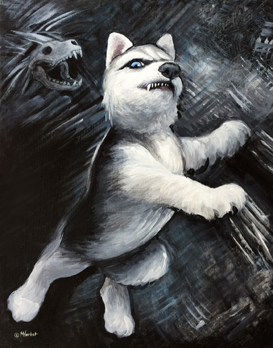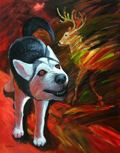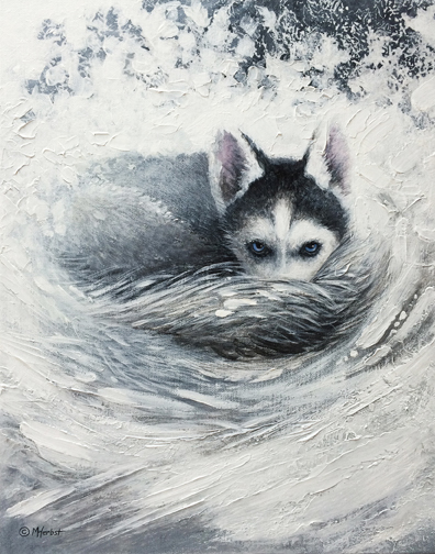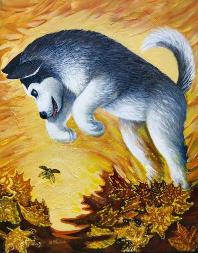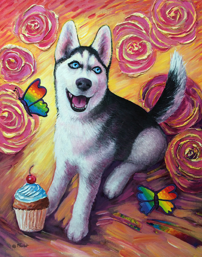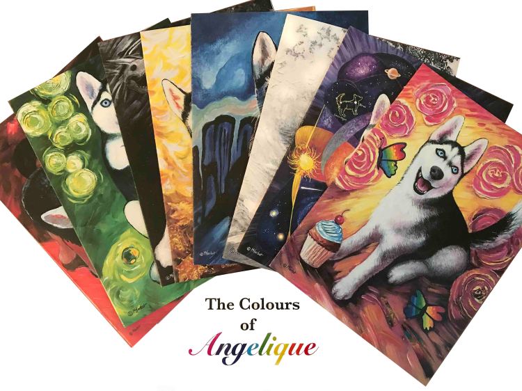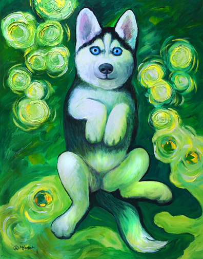 Psychological research has classified six facial expressions which correspond to distinct universal human emotions. These expressions are: happiness, sadness, surprise, fear, anger and disgust. Believe it or not, dogs exhibit outward expressions of emotion as well. The expressions of emotion in dogs mostly involve body language; but they are pretty unmistakable. This series of paintings depicts our husky puppy, Angelique. Her body language inspired me to “colour code” this series of paintings to emphasize her moods. I have used artistic license with these doggy emoticons, of course.