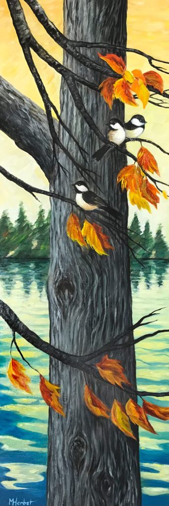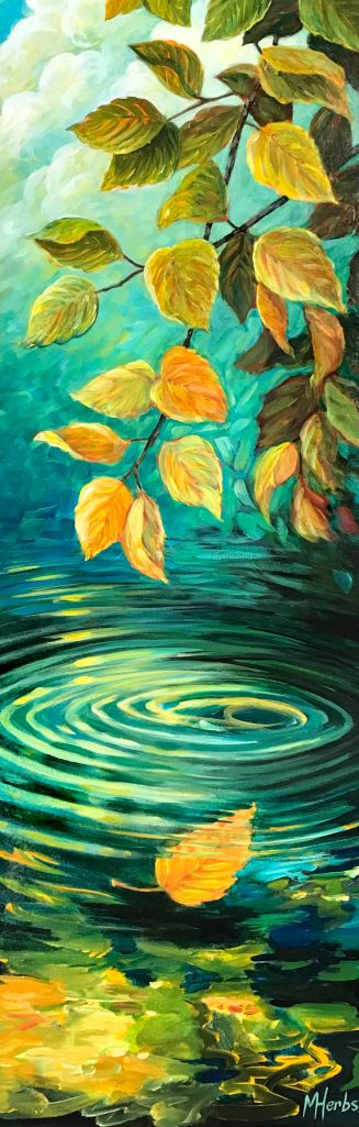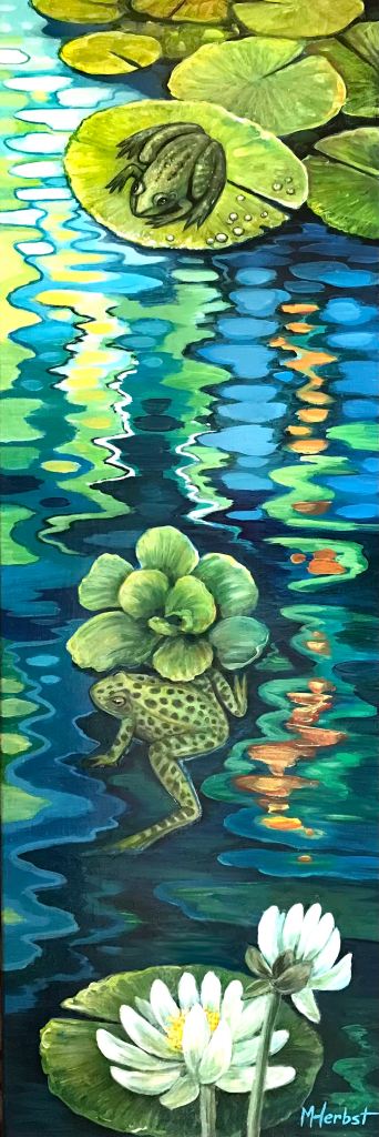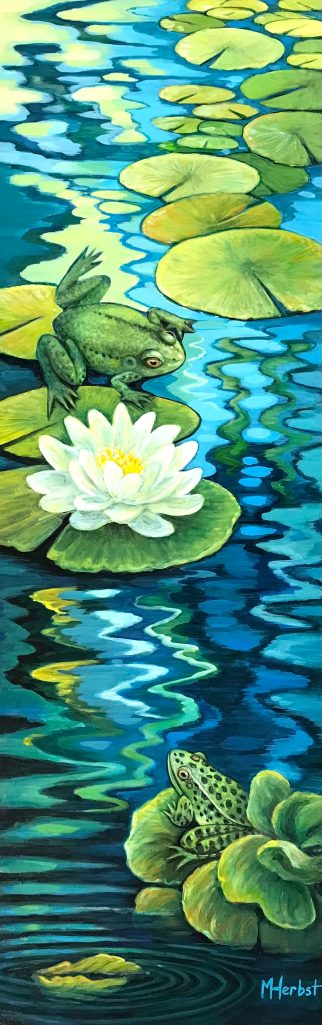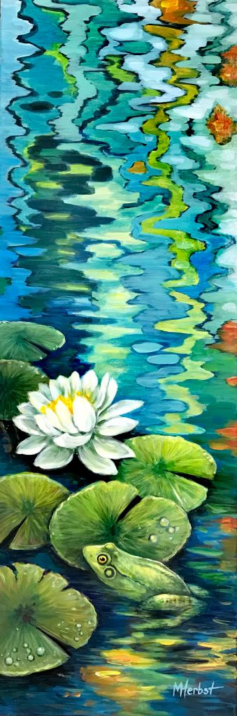 I’m inspired by the natural world and the ebb and flow of the seasons in the Kawartha Iakes. The ripples in my garden pond and the dancing reflections along the shoreline of the lake are captivating. The frogs that overwintered in the pond are so tame. They sun themselves on the water cabbage, lily pads and water hyacinths and are not at all camera shy. I enjoy the artistic challenge of combining the animals and plants and the elements of form, colour and light in a way that leads the eye through the composition.